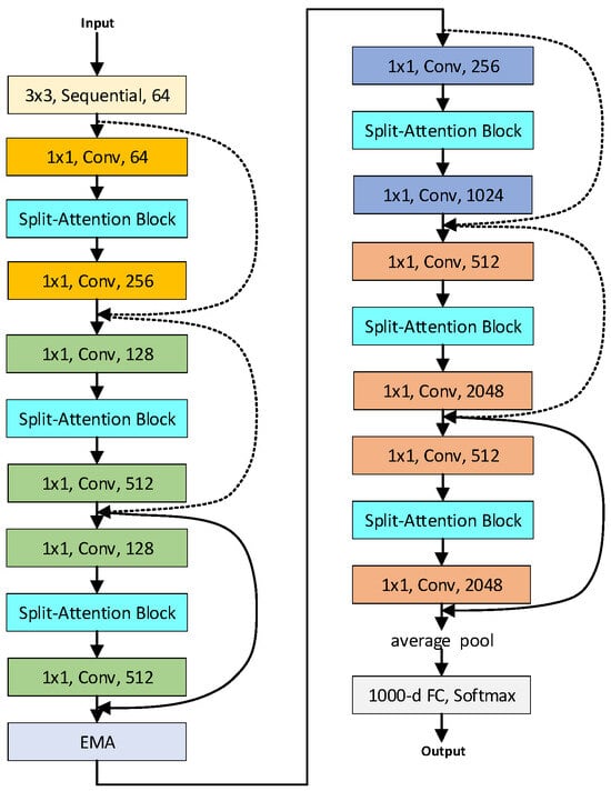 Based on ResNeSt and the EMA, this study proposes an improved ResNeSt_E network, the structure of which is illustrated in Figure 5. We reduced the number of network layers of ResNeSt and added an EMA module to improve accuracy while simultaneously reducing the memory of the model and improving the FPS, and this made the model more suitable for end devices.