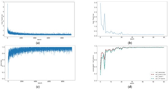 Training ResNeSt_E on the combined dataset. The hyperparameters of the training process are set as follows: the batch size is 32; the epoch is 60; the loss function is the cross-entropy loss function; the optimizer is Adam; the learning rate is adjusted by using the StepLR function; the number of learning rate descent intervals is set to 5; and the learning rate adjustment multiplier is set to 0.5. The training process and results are presented in Figure 6.