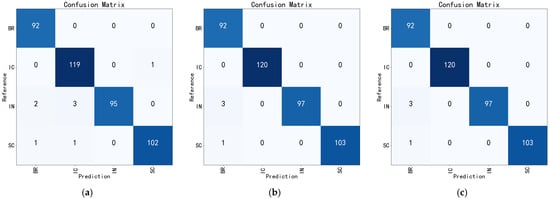 Confusion matrix of ResNeSt_E on the test set: (a) FA + KPCA, (b) KPCA + FA, (c) PCA + FA.
