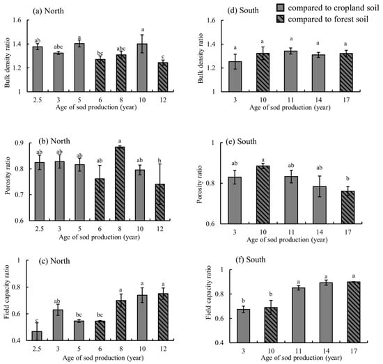Variation in soil bulk density (a,d), porosity (b,e), and field capacity (c,f) across different production years in the north and south. For ratios of each sod production plot, N-2.5, N-3, N-5, and N-10 were compared with corn/wheat cropping, S-3, S-11, and S-14 were compared with rice cropping, and N-6, N-8, N-12, S-10, and S-17 were compared with forest soil. Different letters represent significant differences according to Duncan’s test (p < 0.05).