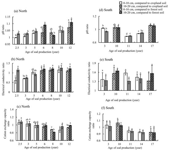 Variation in soil pH (a,d), electrical conductivity (b,e), and cation exchange capacity (c,f) across different production years in the north and south. For ratios of each sod production plot, N-2.5, N-3, N-5, and N-10 were compared with corn/wheat cropping, S-3, S-11, and S-14 were compared with rice cropping, and N-6, N-8, N-12, S-10, and S-17 were compared with forest soil. Different letters represent significant differences according to Duncan’s test (p < 0.05).