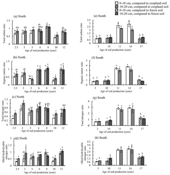 Variation in soil total carbon (a,e), organic matter (b,f), total nitrogen (c,g), and alkali-hydrolyzable nitrogen (d,h) across different production years in the north and south. For ratios of each sod production plot, N-2.5, N-3, N-5, and N-10 were compared with corn/wheat cropping, S-3, S-11, and S-14 were compared with rice cropping, and N-6, N-8, N-12, S-10, and S-17 were compared with forest soil. Different letters represent significant differences according to Duncan’s test (p < 0.05).