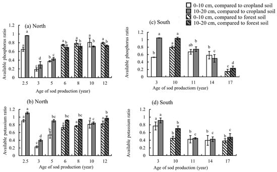 Variation in soil available phosphorus (a,c) and available potassium (b,d) with different production years in the north and south. For ratios of each sod production plot, N-2.5, N-3, N-5, and N-10 were compared with corn/wheat cropping, S-3, S-11, and S-14 were compared with rice cropping, and N-6, N-8, N-12, S-10, and S-17 were compared with forest soil. Different letters represent significant differences according to Duncan’s test (p < 0.05).