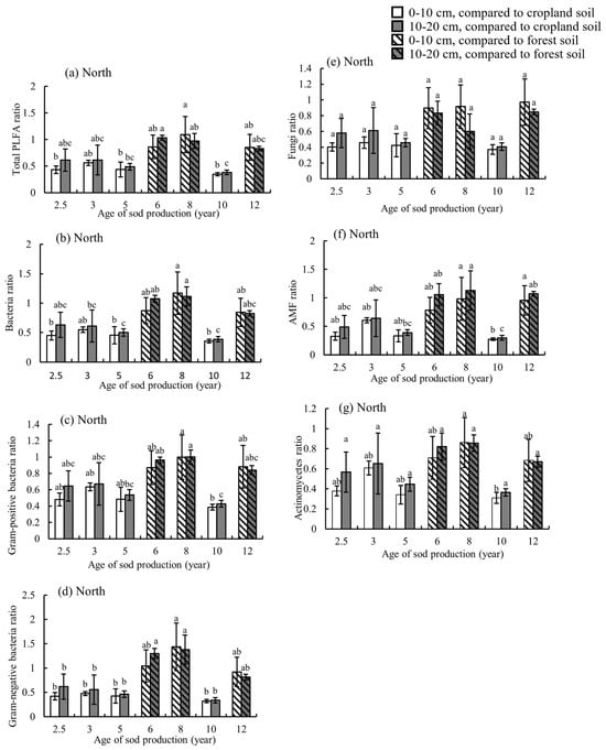 Variation in soil biological properties including (a) total phospholipid fatty acids, (b) bacteria, (c) Gram-positive bacteria, (d) Gram-negative bacteria, (e) fungi, (f) Arbuscular mycorrhizal fungi, and (g) actinomycetes with different production years in the north. For ratios of each sod production plot, N-2.5, N-3, N-5, and N-10 were compared with corn/wheat cropping, S-3, S-11, and S-14 were compared with rice cropping, and N-6, N-8, N-12, S-10, and S-17 were compared with forest soil. Different letters represent significant differences according to Duncan’s test (p < 0.05).