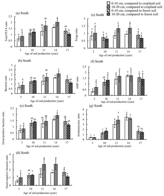 Variation in soil biological properties including (a) total phospholipid fatty acids, (b) bacteria, (c) Gram-positive bacteria, (d) Gram-negative bacteria, (e) fungi, (f) Arbuscular mycorrhizal fungi, and (g) actinomycetes with different production years in the south. For ratios of each sod production plot, N-2.5, N-3, N-5, and N-10 were compared with corn/wheat cropping, S-3, S-11, and S-14 were compared with rice cropping, and N-6, N-8, N-12, S-10, and S-17 were compared with forest soil. Different letters represent significant differences according to Duncan’s test (p < 0.05).