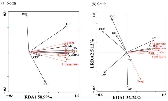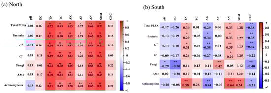 In the south, total PLFA was positively correlated with TN, AN, and SOM (p < 0.05), but negatively correlated with AK and CEC. Similarly, B, and G+ were positively correlated with TN and AN, and negatively correlated with AK and CEC. G− was positively correlated with AN (p < 0.05). Fungi were positively correlated with AP (p < 0.01) but negatively correlated with pH, EC, and CEC (Figure 7b). Actinomycetes also showed positive correlations with TN, AN, and SOM (p < 0.01), and negative correlations with AK and CEC.