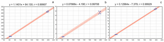 All statistical calculations were performed using Statistica software, ver. 13.3 (StatSoft Inc., Tulsa, OK, USA). The data were expressed as the mean ± standard deviation (SD) of 2 series and 3 independent measurements for each sample (n = 6). To determine whether a random sample came from a population with a normal distribution, the Student’s t-test was applied. In the case where the hypothesis on the normal distribution was rejected, non-parametric statistics were used in further analyses. Correlation and regression analyses between variables were performed. The dependence between variables was presented using Pearson’s linear correlation coefficient.