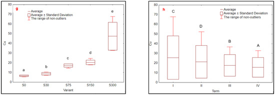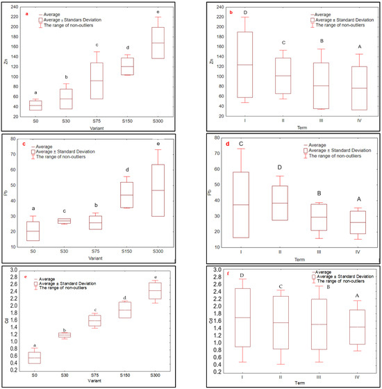 Box and whiskers plot: (a) average Zn content for the variant, (b) average Zn content for the term, (c) average Pb content for the variant, (d) average Pb content for the term, (e) average Cd content for the variant, (f) average Cd content for the term, (g) average Cu content for the variant, (h) average Cu content for the term. A–D—different uppercase letters indicate significant differences for the research term; a–e—different lowercase letters indicate significant differences in the dose of sewage sludge.