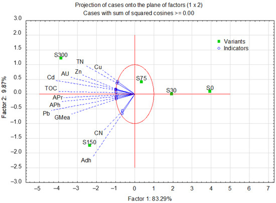 Biplot—combination of bivariate factor plot for EOM doses as cases (S0, S30, S150, S300) with bivariate factor plot for variables such as TOC, TN, C/N, Zn, Cu, Pb, Cd, Aph, AU, APr, ADh, GMea.