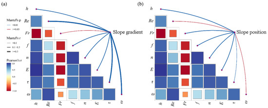 Mantel test and correlation between hydrodynamic parameters and topographic factors. Note: (a) slope gradient vs. hydrodynamic parameters, (b) slope position vs. hydrodynamic parameters.