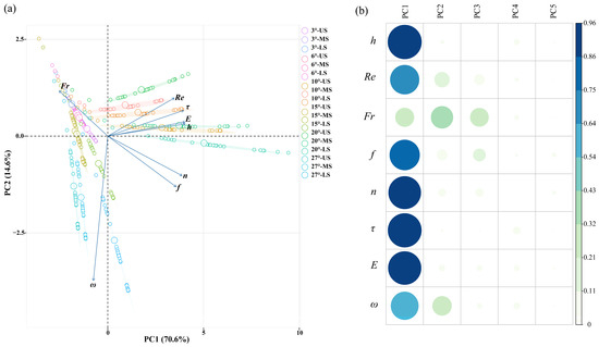 PCA analysis of hydrodynamic parameters across various slope gradients and slope positions. Note: (a) biplot of PCA principal component analysis of hydrodynamic parameters; (b) heat map of Cos2 values for each factor, where Cos2 values range from 0 to 1, with darker colors indicating larger values. US means upper slope; MS means middle slope; and LS means lower slope.