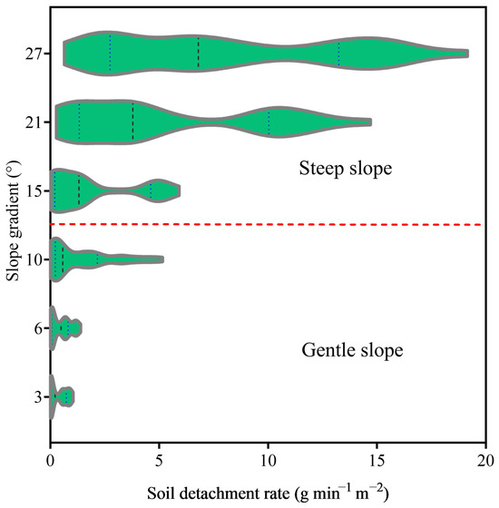Soil detachment rate under different slope gradients. The dashed red line indicates approximate boundary between gentle slope and steep slope.