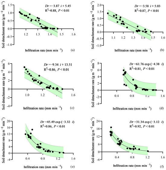 Relationship between the soil separation rate (Dr) and the infiltration rate (i) under different slope gradient treatments. Note: (a) 3°, (b) 6°, (c) 10°, (d) 15°, (e) 21°, and (f) 27°. The shaded areas corresponded to 95% confidence intervals.
