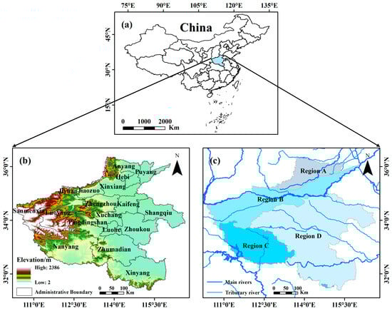The position of China (a), distribution of elevation (b), and watershed divisions (c) in Henan Province.