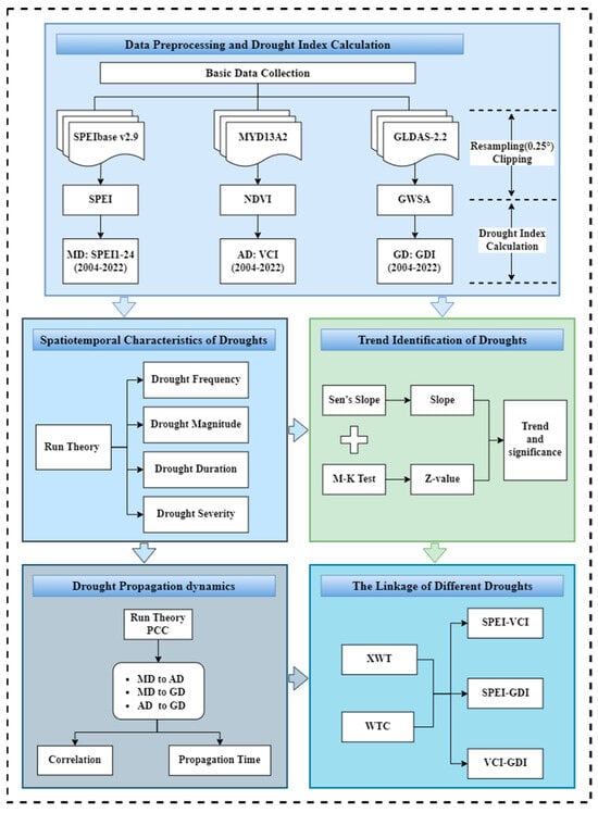 In this study, the Standardized Precipitation Evapotranspiration Index (SPEI), Vegetation Condition Index (VCI), and Groundwater Drought Index (GDI) were utilized to identify MD, AD, and GD, respectively. The classification levels for these drought indices are presented in Table 1. The trends of different types of droughts were analyzed using Sen’s slope method and the Mann–Kendall trend test. The Pearson correlation coefficient and theory of run were employed to identify the propagation time between different types of droughts. The relationships among these three types of droughts were explored using cross-wavelet transform (XWT) and wavelet coherence (WTC). The flowchart of this study is illustrated in Figure 2.