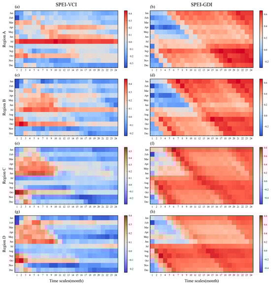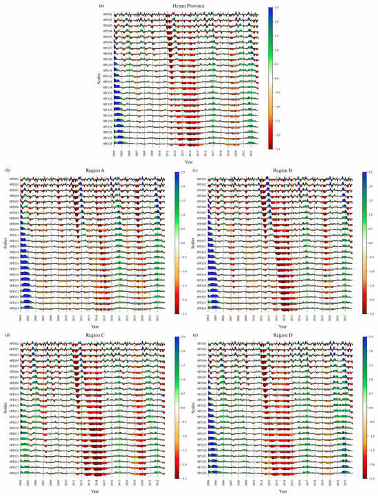 SPEI at the 1–24-month scales of Henan Province and its different subregions from 2004 to 2022 (calculated based on the entire region (a), Region A (b), Region B (c), Region C (d), and Region D (e)). The upper section of the horizontal axis represents wet conditions (blue), and the lower section represents dry conditions (red).
