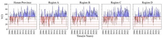 Temporal changes in the monthly VCI in Henan Province and its subregions during 2004–2022. The upper section of the horizontal axis represents wet conditions (blue), and the lower section represents dry conditions (red).