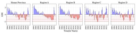 Temporal changes in the monthly GDI in Henan Province and its subregions during 2004–2022. The upper section of the horizontal axis represents wet conditions (blue), and the lower section represents dry conditions (red).