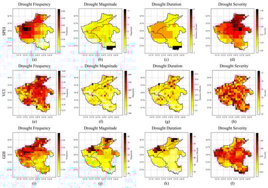 Spatial distribution of meteorological, agricultural, and groundwater drought characteristics based on the monthly SPEI (a–d), VCI (e–h), and GDI (i–l) in Henan Province during 2004–2022.