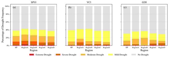 Drought frequency at different severity levels of meteorological, agricultural, and groundwater drought based on the monthly SPEI (a), VCI (b), and GDI (c) in Henan Province during 2004–2022.