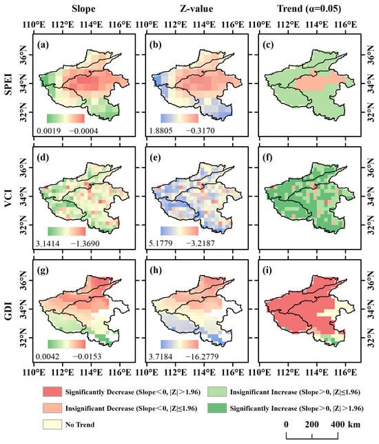 Spatial distributions of SPEI (a–c), VCI (d–f), and GDI (g–i) variation trends and significance tests in Henan Province from 2004 to 2022. From left to right, the three columns indicate the trend degree in Sen’s slope estimate, the Z statistic from the MK test, and the superposition analysis of the first two.