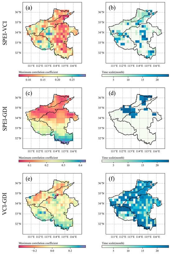 Spatial distributions of the maximum correlation coefficient (a,c,e) and propagation time (b,d,f) of SPEI-VCI (a,b), SPEI-GDI (c,d), and VCI-GDI (e,f) in Henan Province.