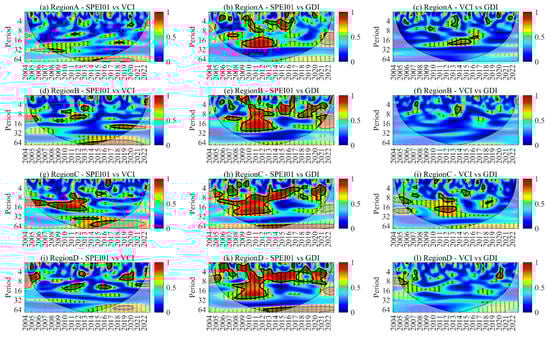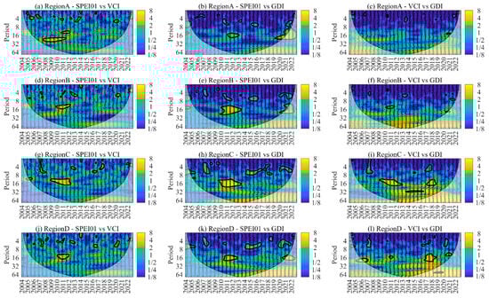 However, XWT does not perform well in low-energy regions and this problem can be mitigated through the application of WTC []. WTC evaluates the correlation between two time series as a function of frequency, and its value varies between 0 and 1 []. This method can be interpreted as the decomposition of the correlation coefficient across various scales []. After normalizing the wavelet energy of and , the WTC can be calculated by the following equation: