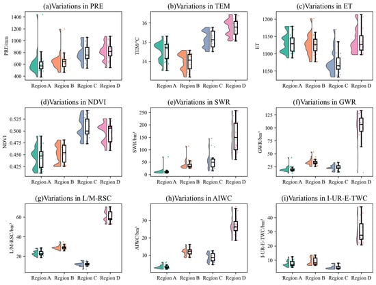 Based on Figure 8a–c, it is evident that the slope of the SPEI ranged from −0.0004 to 0.0019. Only the eastern region showed an insignificant decreasing trend, while the other areas exhibited an insignificant increasing trend. This indicated a pronounced exacerbation of MD in the northern part of Region D. Analysis of Figure 8d–f revealed that the slope of the VCI varied between −1.3690 and 3.1414, with Z-values ranging from −3.2187 to 5.1779. Spatial variations and differences in distribution across the whole area were apparent. Nevertheless, AD across the province was gradually alleviated. Figure 8g–i demonstrate that the slope of the GDI ranged from −0.0153 to 0.0042, with Z-values falling between −16.2779 and 3.7184. GDI values were significantly decreasing across the entire province, except for minor increases or no changes in certain areas of Regions C and D, indicating a progressive worsening of GD. Furthermore, MD, AD, and GD in Region D tended to cluster, particularly MD and GD. However, this pattern was less pronounced in the other regions.