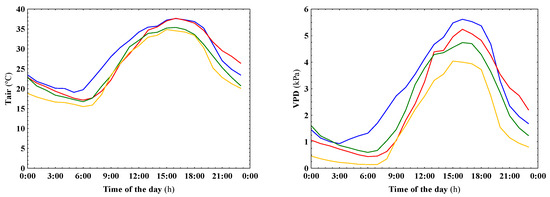 Atmospheric patterns on the measurement days. The figure illustrates the measurements of air temperature (Tair, °C) and air vapor pressure deficit (VPD, kPa) measured on 15 July (blue) and 10 (red), 18 (green), and 26 August 2021 (yellow) at the experimental plot.