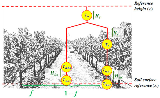 Variations in the sensible heat fluxes between rows (Hbs), were accounted for as a difference in temperatures across the bare soil and air resistances [29], as described by Equation (13):