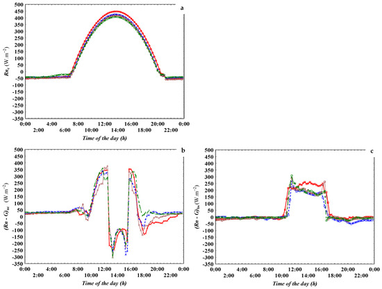 Energy balance models are valuable tools for understanding how available radiative energy is partitioned into sensible and latent heat fluxes within a system. The Shuttleworth and Wallace model is considered suitable for assessing the crop energy balance in dense, homogeneous crops with horizontal canopies that completely cover the soil [24]. The model’s general expression for partitioning the available radiation (Rn − G, where Rn is the net solar radiation and G is the soil heat flux) into latent heat flux (LE) and sensible heat flux (H) can be written as proposed by Shuttleworth and Wallace [20] in the following form (Equation (1)):