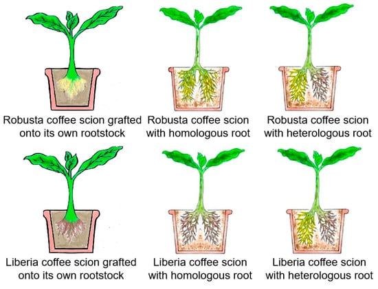 C. canephora cv. Robusta was grafted with C. canephora cv. Robusta to produce Robusta homologous double-root coffee (intolerant to continuous cropping soil). Coffea Liberica was grafted with Coffea Liberica to produce Liberica homologous double-root coffee (tolerate continuous cropping soil). Robusta–Liberica heterologous double-root coffee (tolerate continuous cropping soil) was created by grafting C. canephora cv. Robusta with Coffea Liberica (Figure 1).