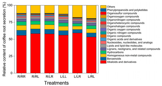 There were significant differences in the types of coffee root exudates among different grafting combinations (Table 1). An interaction effect between grafting combinations and coffee species was observed on certain coffee root exudates (Table 1). The contents of lignans, neolignans, and related compounds and organic oxygen compounds in C. canephora cv. Robusta root exudates were significantly reduced by 12.01% and 9.06% when adjacent to the Coffea Liberica root. Conversely, the contents of benzenoids, lignans; neolignans, and related compounds; organic acids and derivatives; organic oxygen compounds; organoheterocyclic compounds; and phenylpropanoids and polyketides in Coffea Liberica root exudates decreased significantly by 20.42%, 21.06%, 22.94%, 24.37%, 23.06%, and 32.56%, respectively, compared with the control seedlings after being grafted with C. canephora cv. Robusta root system.