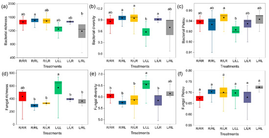 Effects of different grafting treatments on Robusta and Liberica rhizosphere soil microbial (bacterial (a–c) and fungal (d–f)) richness (a,d), alpha diversity (Shannon index, (b,e)), and evenness (c,f). See Figure 2 for treatment abbreviations. Different letters represents p < 0.05.