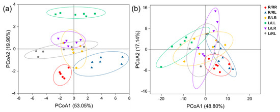 Effects of different grafting treatments on Robusta and Liberica rhizosphere soil bacterial (a) and fungal (b) beta diversity (PCoA) across the experimental period. See Figure 2 for treatment abbreviations.