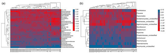 Clustering heat map of rhizosphere bacterial (a) and fungal (b) diversity in C. canephora cv. Robusta and Coffea Liberica at the genus level. See Figure 2 for treatment abbreviations.