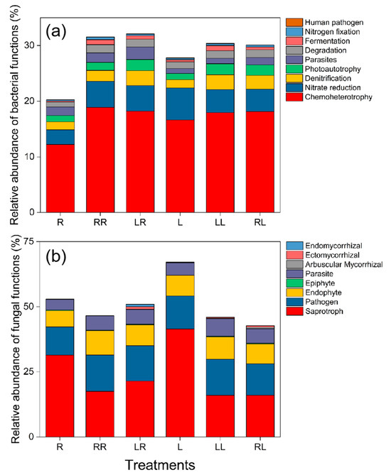 Predicted functional profiles of C. canephora cv. Robusta and Coffea Liberica rhizosphere soil bacteria (a) and fungi (b) under different grafting treatments. See Figure 1 for treatment abbreviations.