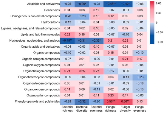 There was a significant negative correlation between the nucleosides, nucleotides, and analogs and bacterial richness (R = 0.45, p < 0.01). There was a significant negative correlation between the alkaloids and derivatives and bacterial diversity (R = 0.39, p < 0.05), although nucleosides, nucleotides, and analogs had negative correlations with bacterial evenness (R = 0.36, p < 0.05), but the response of bacterial evenness to different species and grafting combinations was not significant, showing that nucleosides, nucleotides, and analogs may not be the main reason for affecting bacterial evenness. In contrast, there was a significant positive correlation between the alkaloids and derivatives (R = 0.45, p < 0.01), phenylpropanoids and polyketides (R = 0.56, p < 0.01), and fungal richness; The alkaloids and derivatives (R = 0.42, p < 0.05) and phenylpropanoids and polyketides (R = 0.56, p < 0.01) were positively correlated with fungal diversity (Figure 7).