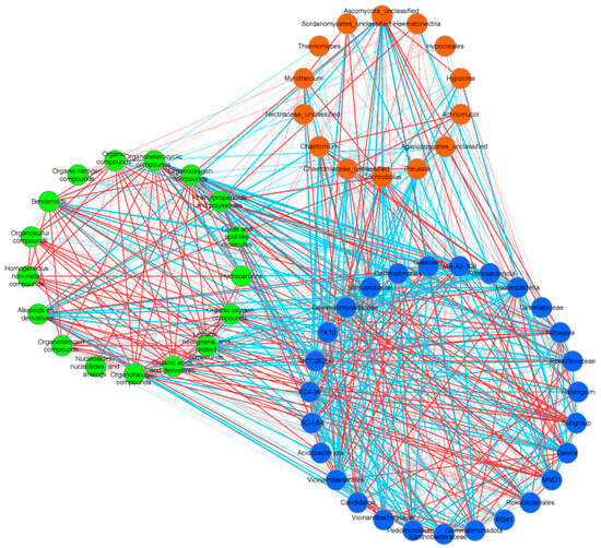 Network interaction diagram of coffee root exudates and soil microbial (bacterial and fungal) taxa at the gene level. The size of the points represents the magnitude of coffee root exudates and soil microbial taxa. Red lines represent the positive correlation, while blue lines represents the negative correlation, and the thickness of the line represents the correlation size.