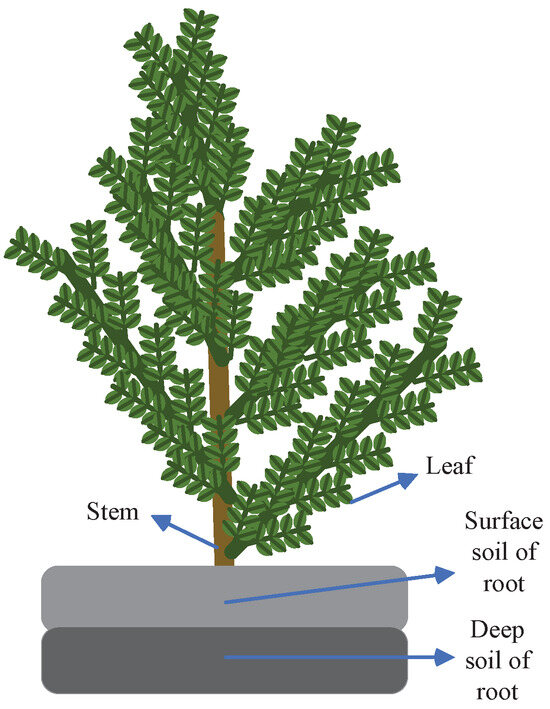 The hyperspectral data on AMM leaves, stems, and the surface and deep layers surrounding AMM roots were captured via a new handheld Specim IQ hyperspectral camera. Detailed parameters and settings of the hyperspectral camera are provided in Appendix A.1.