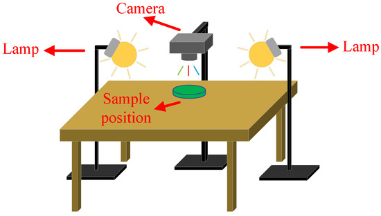 To mitigate the influence of outdoor sunlight angles and obstructions from objects such as clouds on illumination intensity, shooting was conducted in a dark room to minimize external light interference. Two halogen lamps provided focused lighting. Once the angle of the halogen lamps was set, it remained fixed throughout the data collection to minimize errors due to lighting variations. Figure 3 shows the scene of hyperspectral data acquisition.