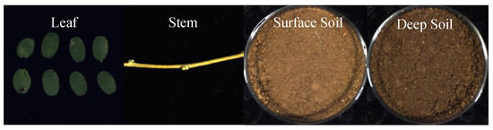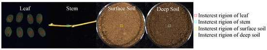During the imaging process, a standard whiteboard was initially photographed, and subsequently, the whiteboard correction function integrated into the hyperspectral camera was employed to mitigate the effects of uneven light intensity. Figure 4 shows the false color data of the hyperspectral data of the harvested AMM leaves, stems, and surface and deep soil surrounding AMM roots.