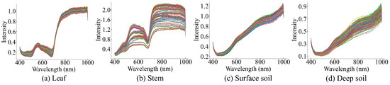 Figure 6 shows the spectral curves corresponding to the regions of interest extracted from the hyperspectral data of AMM leaves, stems, and the surface and deep soil surrounding AMM roots. This shows that the overall trends of the spectral curves of the AMM leaves, stems, and soil surrounding AMM roots are different, with significant differences in reflected light intensity at different wavelengths.