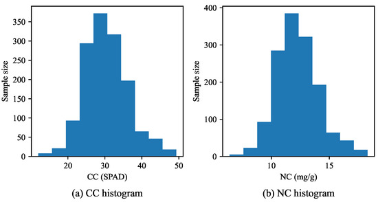 The CC and NC of AMM leaves were measured via a handheld plant parameter detector. Besides, during the process of capturing measurement errors, six measurements were taken separately on each leaf, and the average value was calculated and used as the parameter indicator. Moreover, during the process of capturing the hyperspectral data of the leaves, measurements of the CC and NC of AMM leaves were conducted. A total of 1431 datasets were collected in this study. Figure 7 shows the histograms of the CC and NC distributions of the leaf samples.