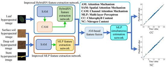 Figure 8 shows the diagram of AM-MHENet. The model inputs consisted of hyperspectral data from AMM leaves, stems, and the surface and deep soil surrounding AMM roots. The model outputs are the CC and NC in the leaves of the AMM. After the features from hyperspectral data of AMM leaves, stems, and the surface and deep soil surrounding AMM roots are extracted via a HybridSN [32] feature extraction network module enhanced by the SAM and CAM, as well as MLP feature extraction network modules [33] improved by the SAM, the separately extracted features are integrated via an AM. Finally, an MLP simultaneous estimation network module is employed to achieve simultaneous estimation results of CC and NC in AMM leaves.