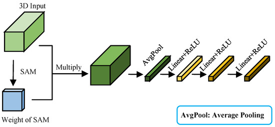 In this study, improved MLP network modules are employed to extract features from the hyperspectral data of stems and soil. Traditional MLP networks result in a loss of spatial information from the hyperspectral data of AMM stems and the surface and deep soil surrounding AMM roots, retaining only spectral information. To fully leverage the spatial information in hyperspectral data without increasing model complexity, the hyperspectral data of stems and soil are initially processed via SAM to emphasize spatial features. The hyperspectral data enhanced by the SAM are then input into the MLP network module for further feature extraction, which improves the performance of the network module. Figure 10 shows the structural diagram of the improved MLP network module.