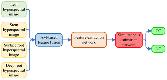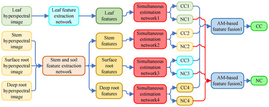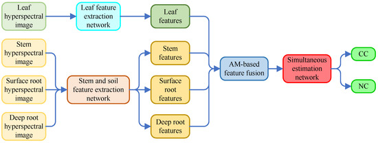 The input hyperspectral data of AMM leaves, stems, and surface and deep soil surrounding AMM roots are processed through dedicated leaf and stem–soil feature extraction network modules, respectively. This results in distinct features for the leaves, stems, and soil. An AM is subsequently used to integrate the extracted features. Finally, a simultaneous estimation network module is employed to simultaneously estimate the CC and NC of the AMM leaves.