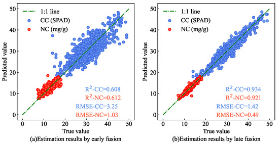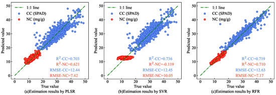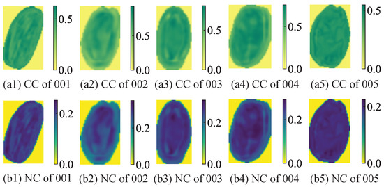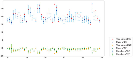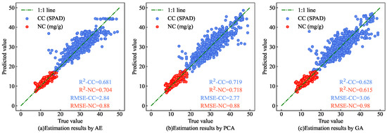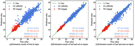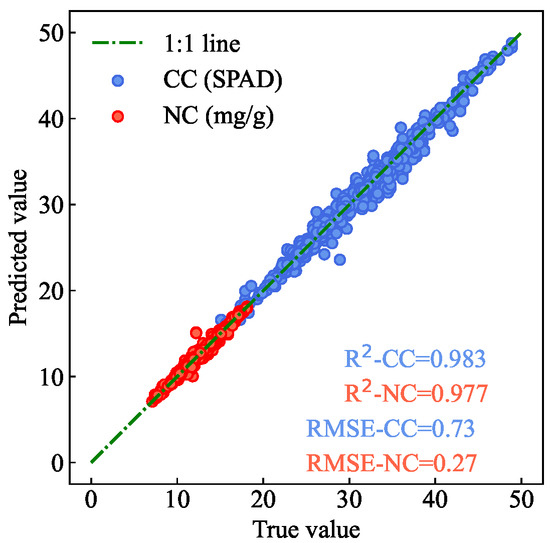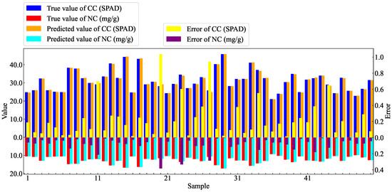 Figure 15 shows the comparison bar chart of the predicted values versus the true values for CC and NC in AMM leaves within the partial test set. The results indicate that the model’s estimation error for CC can be controlled within 1, while the estimation error for NC is kept within 0.4.