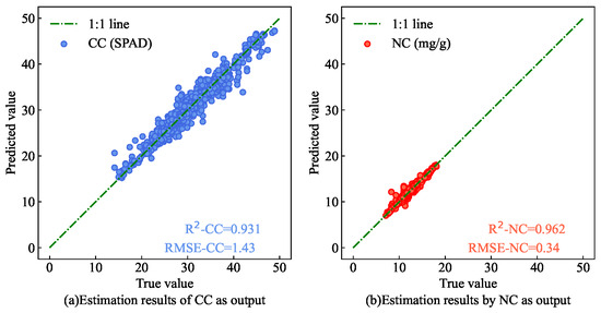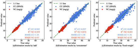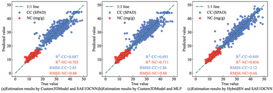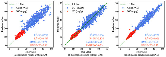 In the test set, AM-MHENet’s estimation of AMM leaf CC achieved an of 0.983, an RMSE of 0.73, an MAE of 0.49, and an RPD of 7.63. For NC, the estimation achieved an of 0.977, an RMSE of 0.27, an MAE of 0.16, and an RPD of 6.62. Figure 14 shows the scatter plot of the AM-MHENet estimation results for CC and NC in the AMM leaf samples from the test set. The scatter points closely align with the 1:1 line, suggesting high accuracy in estimating CC and NC through the AM-MHENet.