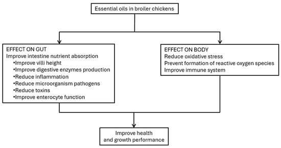 The action mode for essential oils to improve the health and productive performance of broiler chickens is shown in Figure 1. Essential oils improve nutrient absorption mainly due to the improvements in gut condition. Essential oils reduce the growth of pathogenic microorganisms and the toxins they produce; essential oils also prevent the formation of reactive oxygen species (ROS) that affect enterocyte function. The better balance for intestinal microorganisms and the reduction in toxins and oxidative agents (ROS) are beneficial effects of EO on the enterocyte condition. Essential oils also increase the absorption area in enterocytes, mainly villi and crypts. Additionally, EO increases the production of digestive enzymes. All these effects improve the nutrient absorption in chickens. On the other hand, EO also reduces oxidative stress and improves the immune system of chickens. In total, the improvements in productive performance with EO are due to improvements in digestion (gut) and health of broiler chickens (Figure 1).